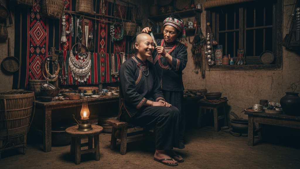 Among the Lahu, hair has long been a social billboard. Older accounts note that in the past both men and women shaved, with married women preserving a small topknot—sometimes called “soul hair” (魂毛 húnmáo)—to distinguish themselves from men; today, many younger Lahu grow or braid their hair, but the wedding-day shave still appears in some villages, especially in remoter mountain areas. The gesture compresses several messages into one blade’s pass: adulthood claimed, status declared, responsibilities accepted.