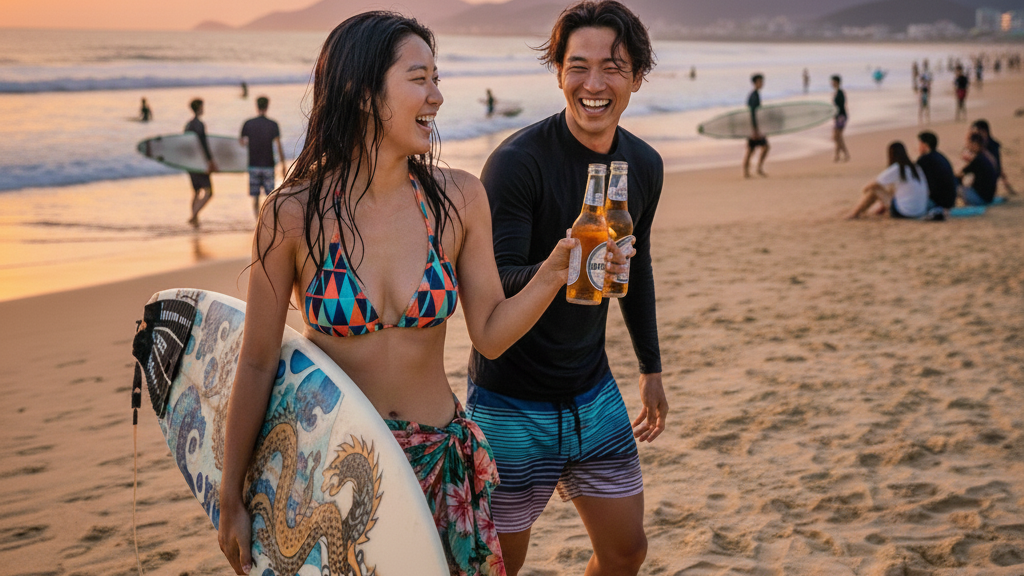 Then came the vibe economy. Surf zones like Surfyy Beach—promoted explicitly as a surfing-only destination with rentals, lessons, and even chill-out “zones,” plus a pub & lounge—package the coast as a curated lifestyle, not just a shoreline. That matters because curated lifestyles attract curated audiences: twenty-somethings chasing waves by day and social heat by night, the kind of crowd that turns a place into a seasonal stage where everyone is slightly more open, slightly more performative, and a lot more online.