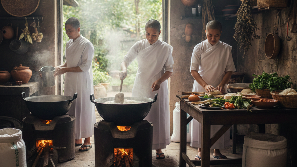 Enter the mae chi (แม่ชี): shaved head, white robes, eight precepts, infinite patience. She wakes before dawn, chants in Pāli, meditates, eats once or twice before noon, cleans the temple, cooks for monks, serves the lay community, and asks for very little. In return? No official status, no Sangha membership, no guaranteed support, no voice in religious governance. Devotion without authority. Holiness without hardware.