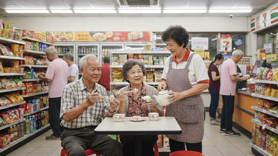 I see it every time I walk through an East Asian city. Elderly couples shuffling into 7-Elevens for dinner, one rice ball, one tea, sharing because it’s cheaper and because conversation has become their most precious luxury. Filial piety, 孝順 (xiàoshùn), is still preached, but love can’t be outsourced to an app, and adult children can’t magically appear in two places at once. Taiwan’s young people are working insane hours, drowning in housing prices, and quietly choosing not to have kids because survival already feels like a full-time job.