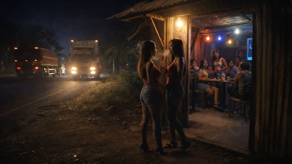 Both venues emerge from similar economic soil. Along East Java’s provincial roads and the Pantura highway, traffic never truly sleeps. Truck drivers, traders, construction workers, and migrant laborers travel long distances, often alone. The roadside café becomes a place not only to rest but to dissolve loneliness. For women working there, the draw is pragmatic. Earnings in factories, farms, or domestic labor are low and unstable. A small café requires little capital. Owners provide space; workers provide charisma, conversation, and — sometimes — more.