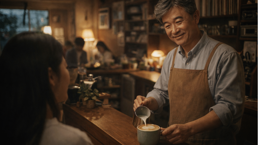 In a quiet Seoul neighborhood, somewhere between a cram school and a convenience store, a man in his late fifties stands behind a polished wooden counter, carefully pouring steamed milk into a cup of dark espresso. His hands are steady. His shirt is neatly pressed. A vinyl record from the 1980s hums softly in the background. He looks up, nods politely, and says, “어서 오세요 (eoseo oseyo — welcome).” He is an 아저씨 (ajusshi), the once-mocked middle-aged Korean uncle. And this is his café.