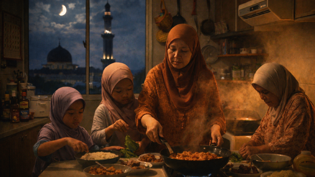 In Jakarta, Kuala Lumpur, Karachi, Dhaka—same movie, different subtitles. Women fasting all day, then performing a second shift that would make corporate CEOs cry. Suhoor alarm at 4:30am. Lunchboxes for the child who is too young to fast. Work calls. Bazaar queues. Iftar prep. Hosting daawat. Cleaning up. Planning Eid outfits. Calculating zakat fitrah for every dependent like a small in-house finance department. And through all of it? Smile. Sabr. Soft voice.