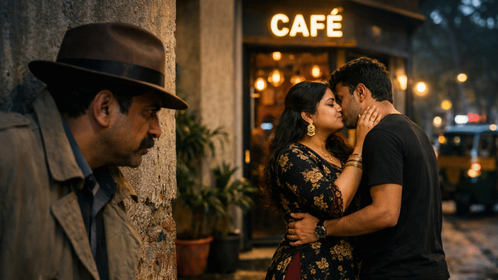 And then there’s the girl. Modern, elegant, golden earrings catching the light. A little soft around the edges — because real women are not airbrushed mannequins. She is dressed with confidence, maybe mixing Western cuts with an Indian silhouette. She is not hiding in a dark alley. She is at the entrance of a respectable café. Yet her affection must be furtive.